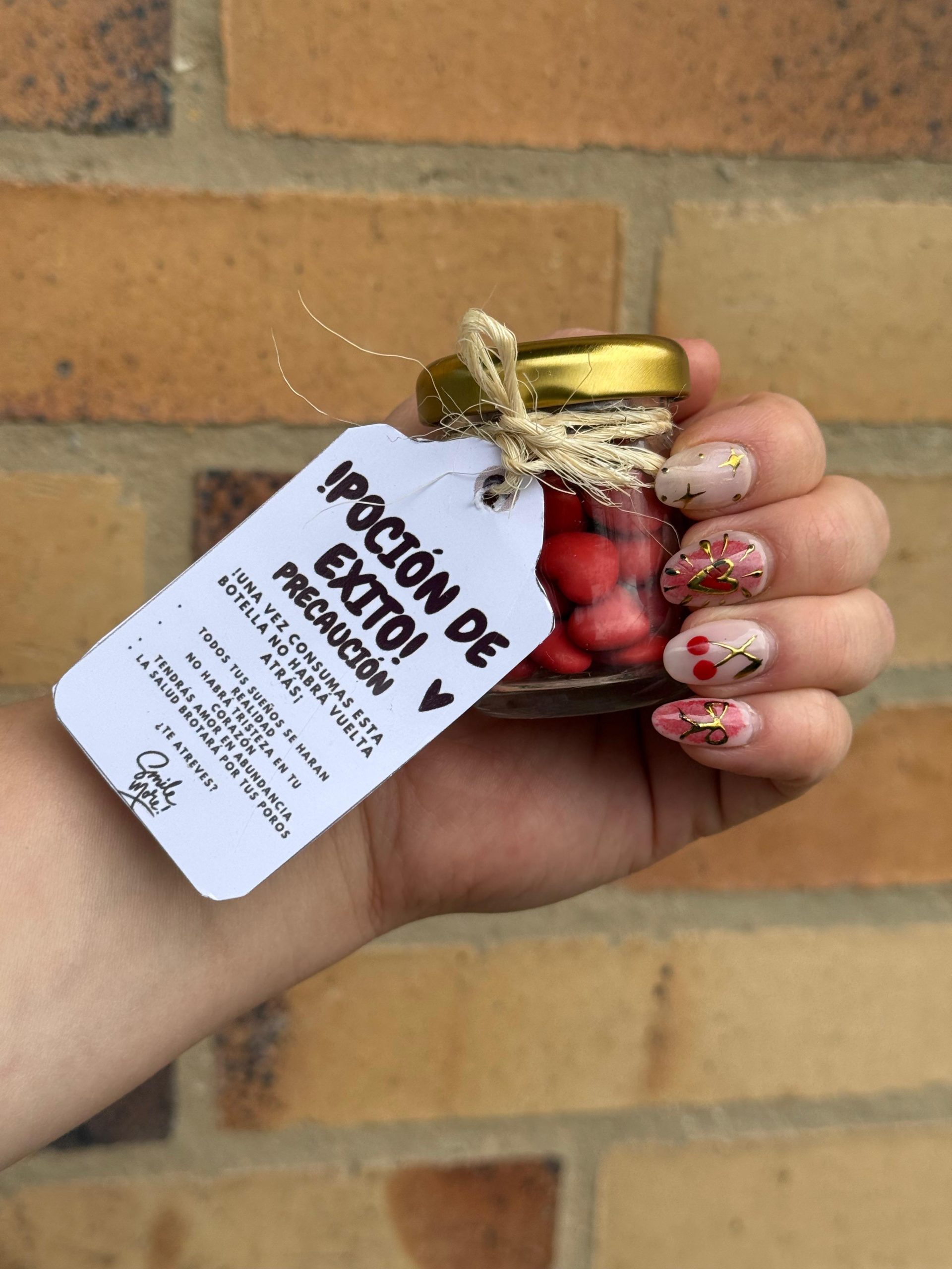 -Poción de éxito (Frasquito con dulces en forma de corazon, con mensaje simbólico de éxito)