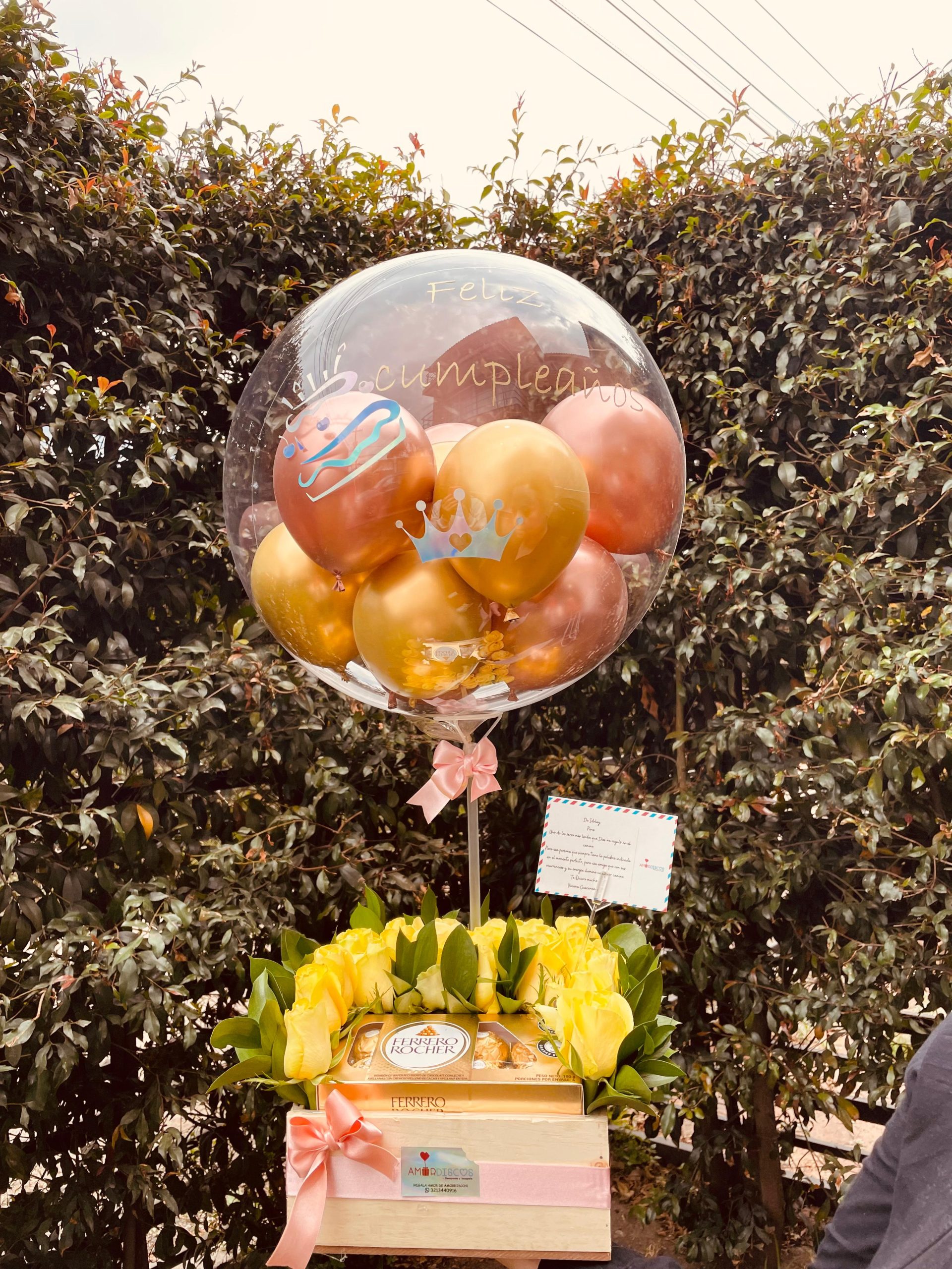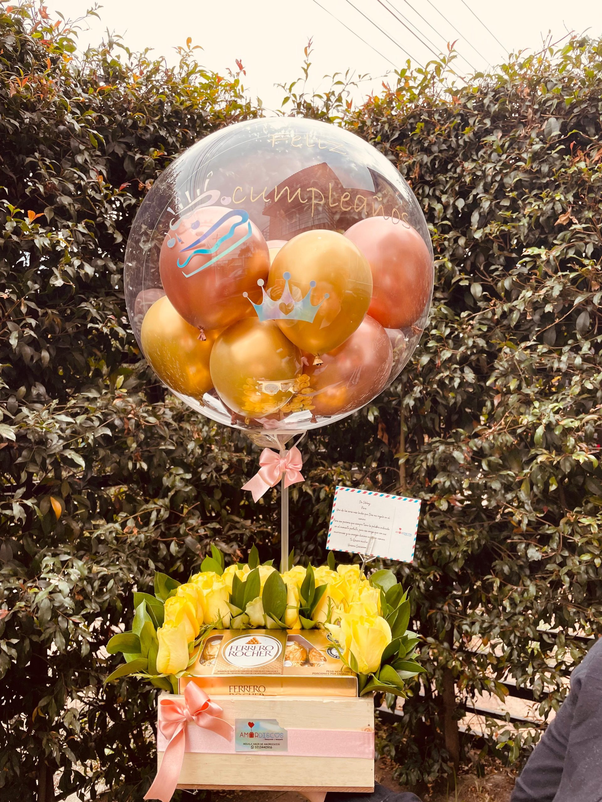 Hermoso arreglo floral con 24 rosas, color según disponibilidad de temporada, con caja de ferrero x 8 unidades, en hermosa decoración con caja, incluye tarjeta tipo postal y globo personalizado