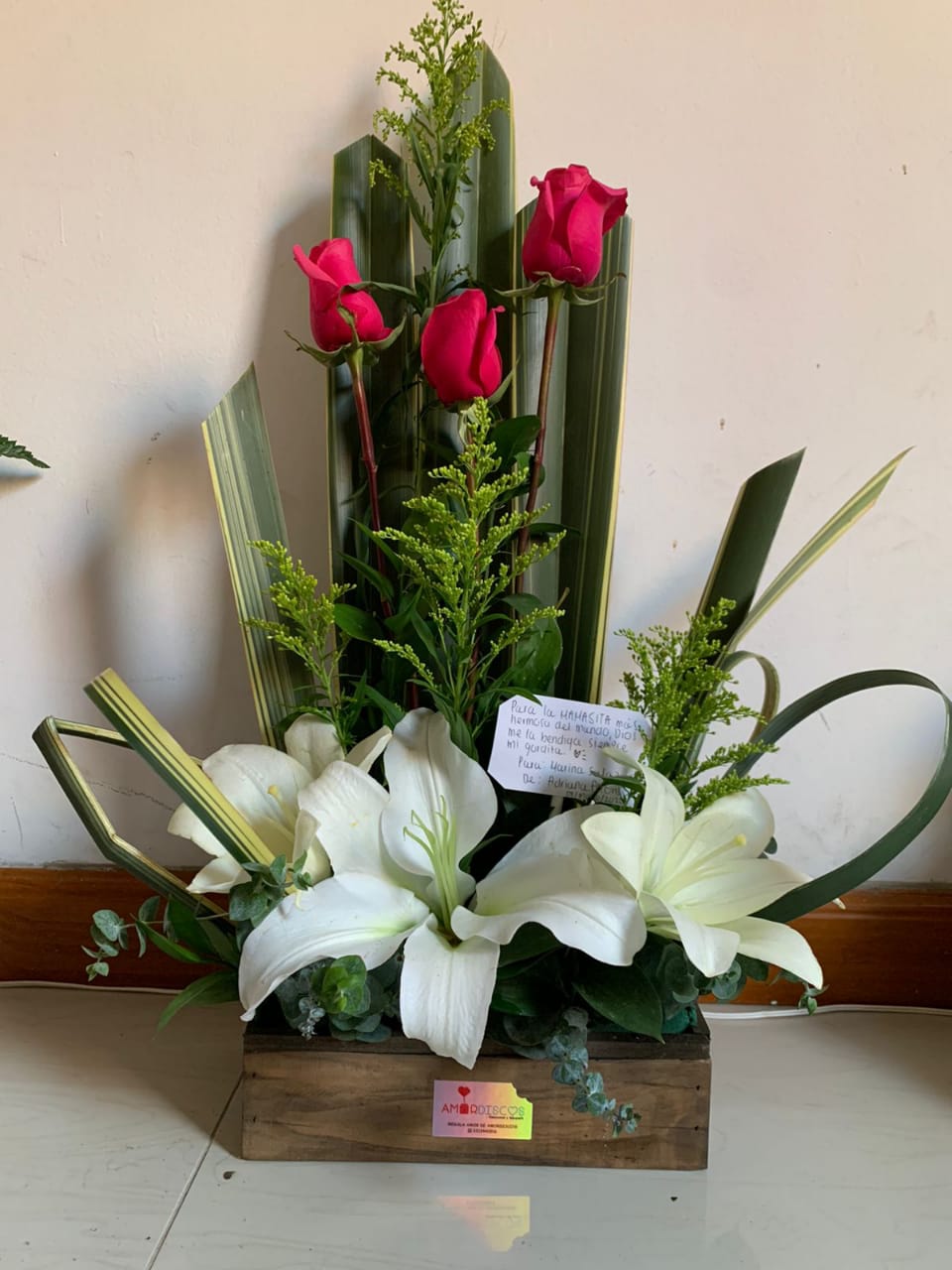 Elegante y sofisticado ramo con 3 Lirios, 3 Rosas, Lino y follaje. Perfecto para regalar