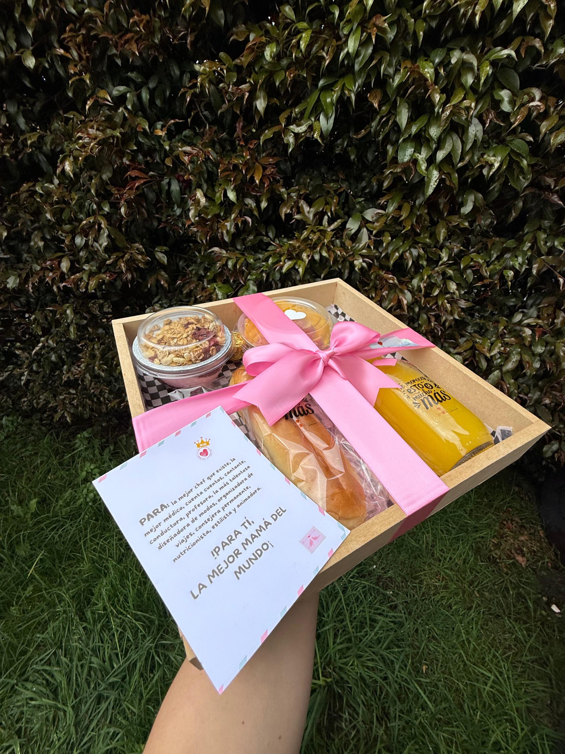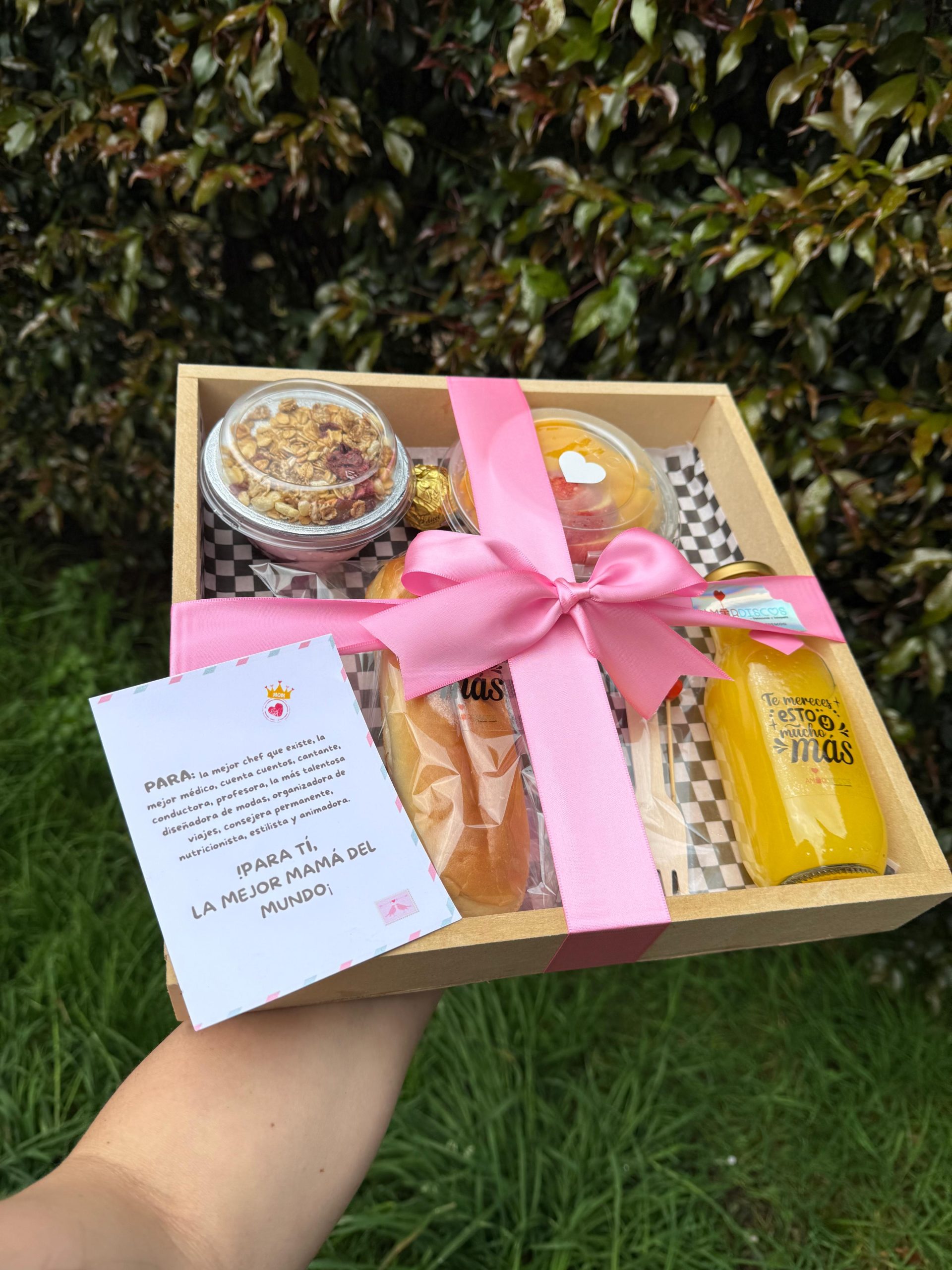 MAMÁ INCOMPARABLE Contiene -Sándwich de jamón y queso -Chocolatina -Jugo de naranja -Frasquito con yogurt y cereal -Fruta picada -Set de cubiertos en madera -Bandeja en madera-tarjeta predeterminada