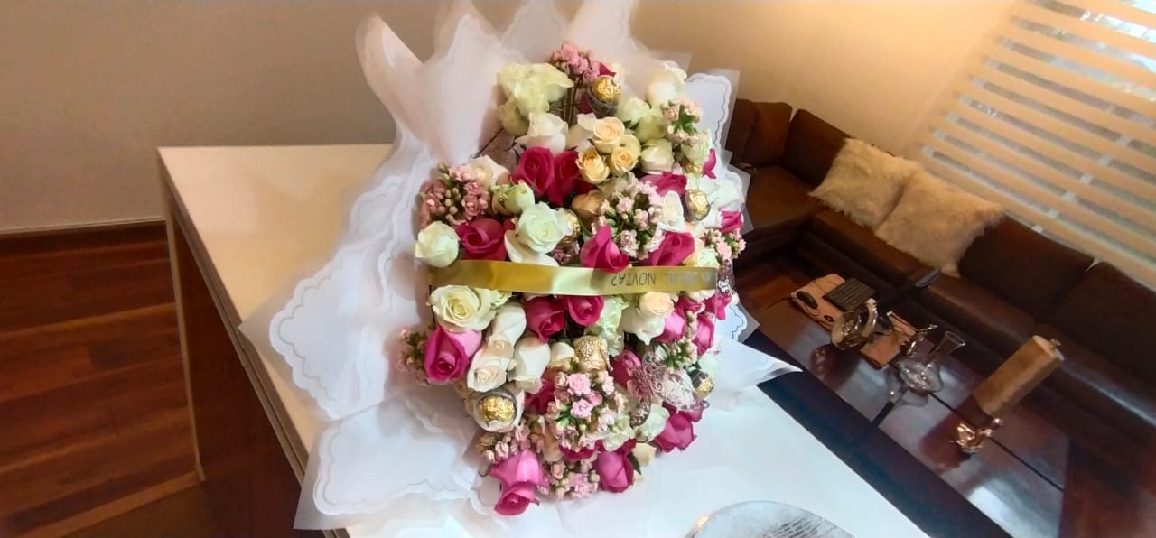 . Hermoso y despampanante ramo en bouquet con rosas, flor de temporada , follage, rosas en miniatura, contiene 8 ferrero en capsula, una corona metálica o plástica miniatura, mariposas, cinta con mensaje según ocasión